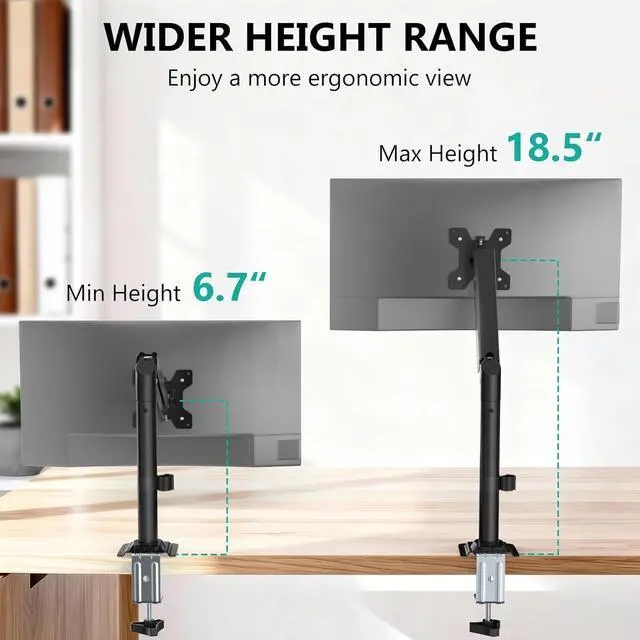 Wide Screen Compatibility: This single monitor mount is compatible with most flat and curved monitors ranging from 13 to 32 inches. It supports VESA patterns 75x75mm and 100x100mm, with a robust weight capacity of up to 19.8 lbs. The sturdy construction provides excellent stability even when moving or adjusting.