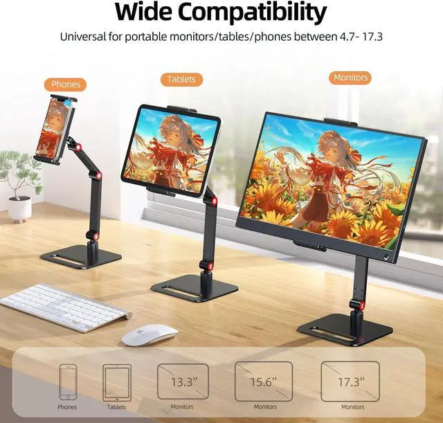 Universal Compatibility This UPERFECT desktop tablet stand fits screens from 4.7 " to 17.3 ", accommodating smartphones, e-readers, large tablets, and portable monitors with ease, ensuring versatile use.