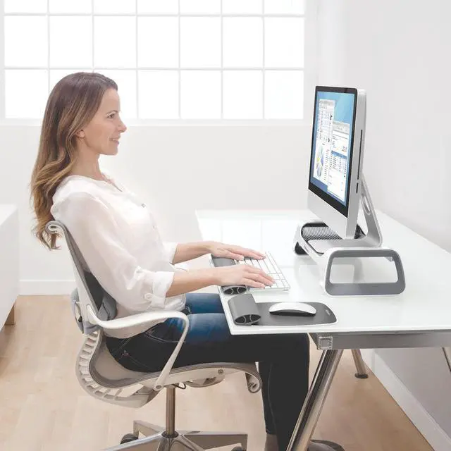 Innovative design elevates monitor 3-3/8" above desktop for enhanced viewing comfort^Helps reduce neck strain and shoulder tension^Supports monitors up to 25 lbs. ^No tools required for assembly^Look for coordinating I-Spire Series products from Fellowes