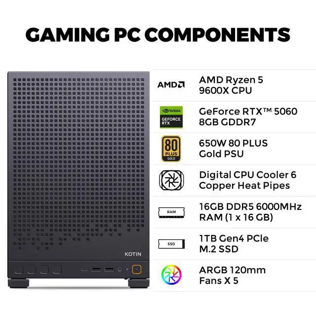 KOTIN Gaming PC D32B, Ryzen 5 9600X Up to 5.4GHz, GeForce RTX 5060 8GB, 650W 80 Plus Gold PSU, Digital Display Air Cooler, 5 ARGB Fans, 16GB DDR5 6000MHz, 1TB PCIe 4.0 SSD, Wi-Fi 7 & Windows 11 Home