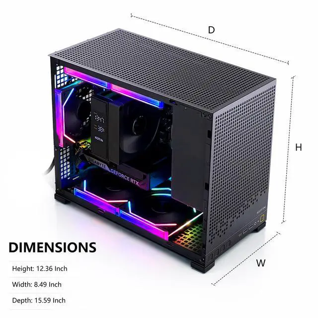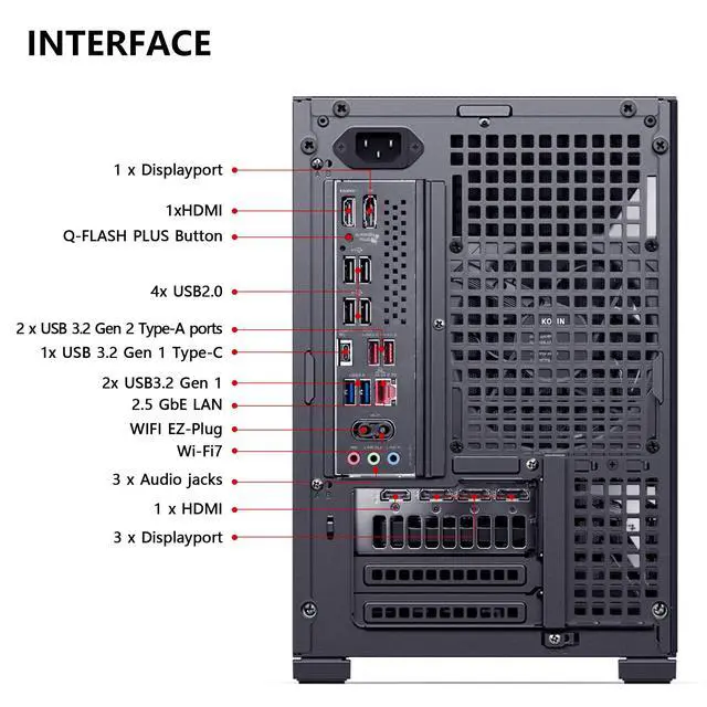 Extensive ConnectivityMotherBorad Including 4 × USB-A 2.0| 2 x USB 3.2 Gen 2 Type-A | 2 x USB 3.2 Gen 1 Type-A | 1 x USB Type-C 3.2 Gen 1 | 1 × LAN | Wi-Fi 7 | Bluetooth 5.3 | 7.1 Channel Audio, In addition, the computer case provides 2 × USB 3.2 Gen 1 Type-A | 1 × USB 3.2 Gen2 Type-C | 2-in-1 headphone and microphone