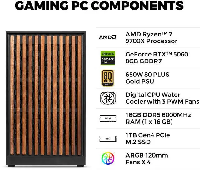 Extreme Gaming PerformancePowered by the AMD Ryzen 7 9700X (up to 5.5GHz) and GeForce RTX 5060 8GB, this gaming PC delivers smooth high-FPS performance for AAA games, esports, streaming, and content creation.Built with a 650W 80 Plus Gold certified PSU for reliable power efficiency,