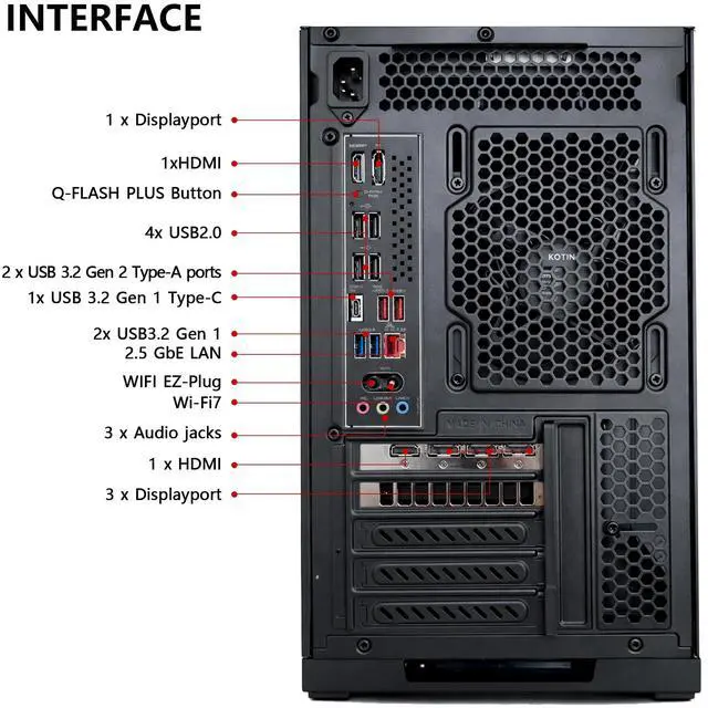 Extensive ConnectivityMotherBorad Including 4 × USB-A 2.0| 2 x USB 3.2 Gen 2 Type-A | 2 x USB 3.2 Gen 1 Type-A | 1 x USB Type-C 3.2 Gen 1 | 1 × LAN | Wi-Fi 7 | Bluetooth 5.3 | 7.1 Channel Audio, In addition, the computer case provides 2 × USB 2.0 Type-A | 2 × USB 3.0 Type-A | 1 × USB 3.2 Gen2 Type-C | 2-in-1 headphone and microphone