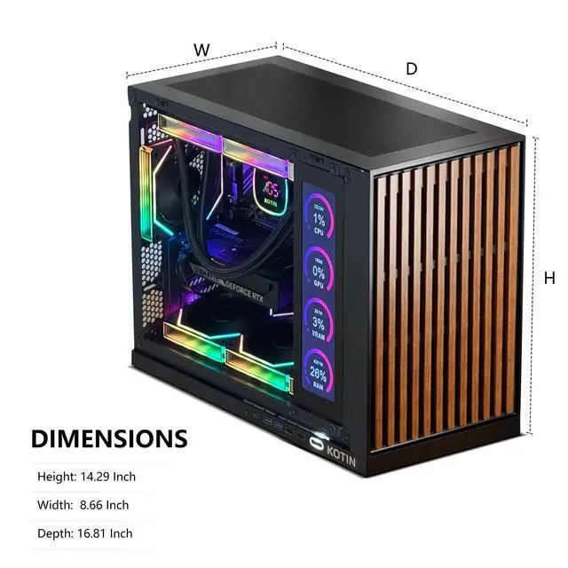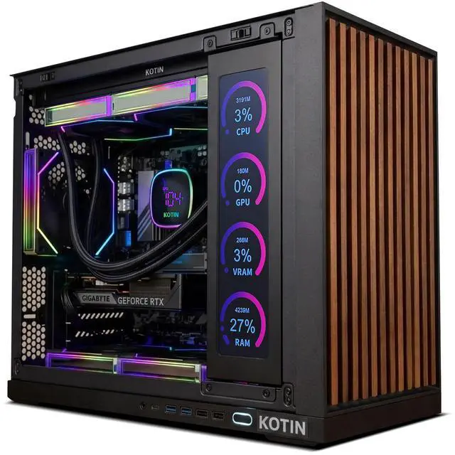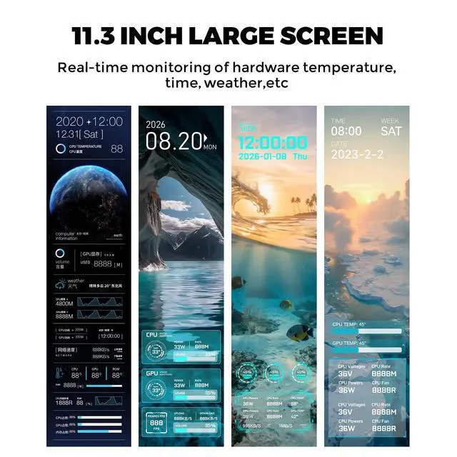 The 11.3-inch built-in display can show time, weather, CPU temperature, and multiple built-in visual themes.