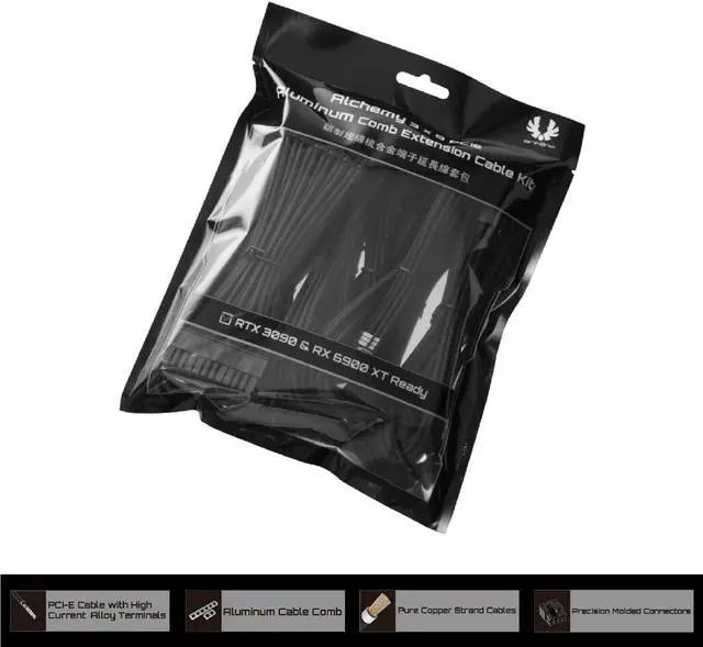 BitFenix Alchemy 3x 8PCIe Aluminum Comb Extension Cable Kit includes 3x PCIe extension cables that will deliver sufficient power to any graphics card, including NVIDIA RTX 3090 or AMD Radeon RX 6900 XT.