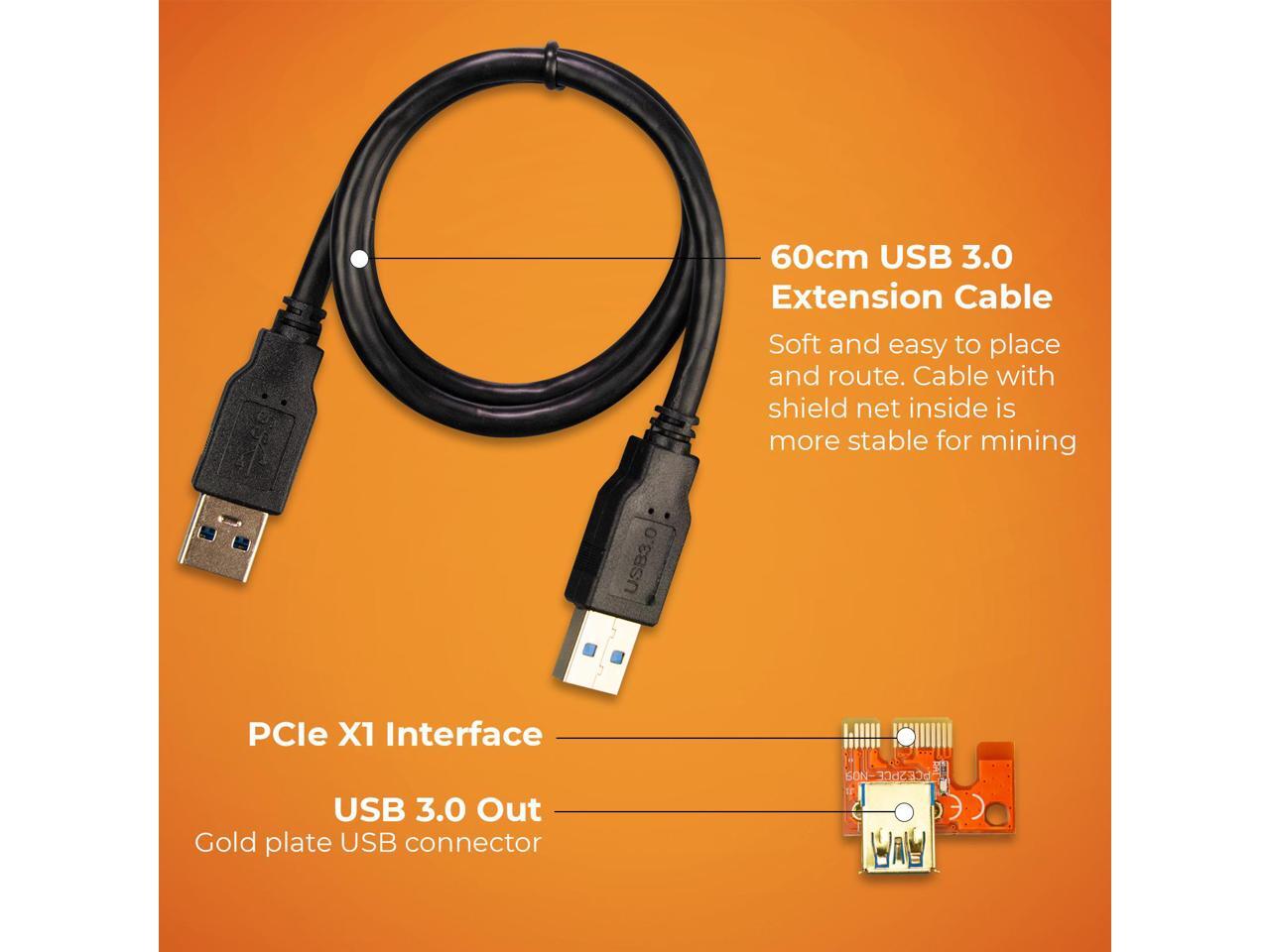 STABLE CABLE: 60cm USB 3.0 cable, very soft and easy to place and route. Cable with shield net inside is more stable for mining. PCI-E 1x to 16x powered riser adapter card with multi-layer shielded wire will not weaken the signal within 3 meters.