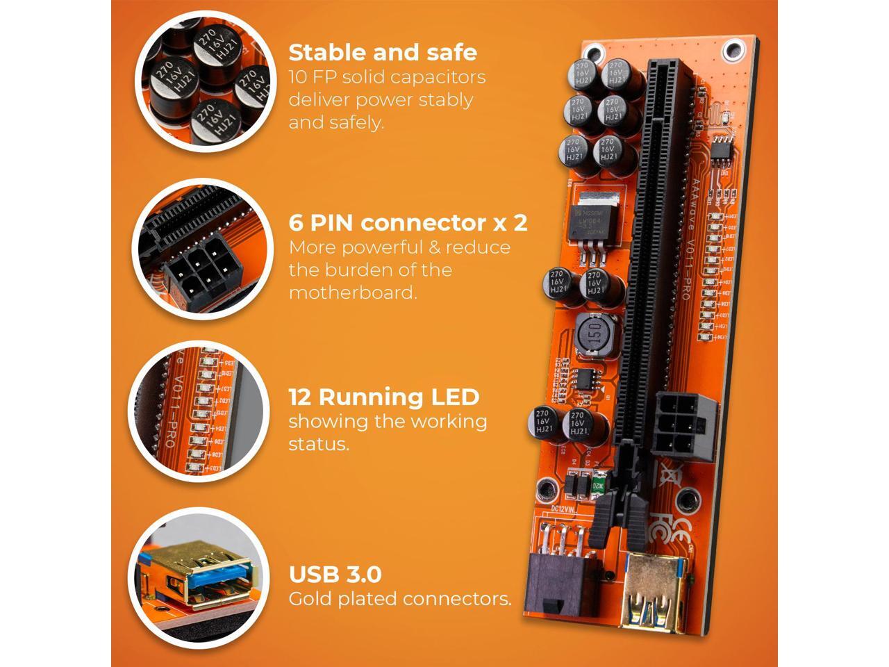 AAAwave PCIE Riser VER 011 PRO 1x to 16x Graphic Extension for GPU Mining 60cm USB 3.0 Cable, 10 Solid Capacitors, 12 Led Lights, 2x 6PIN and 2 Power Options (Pack Of 1)