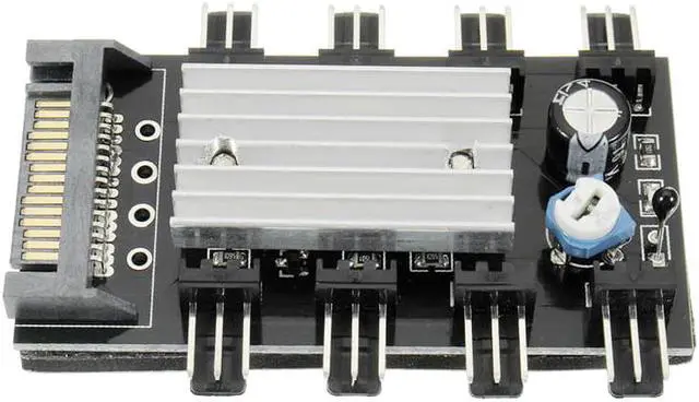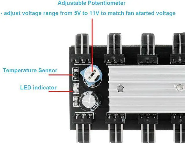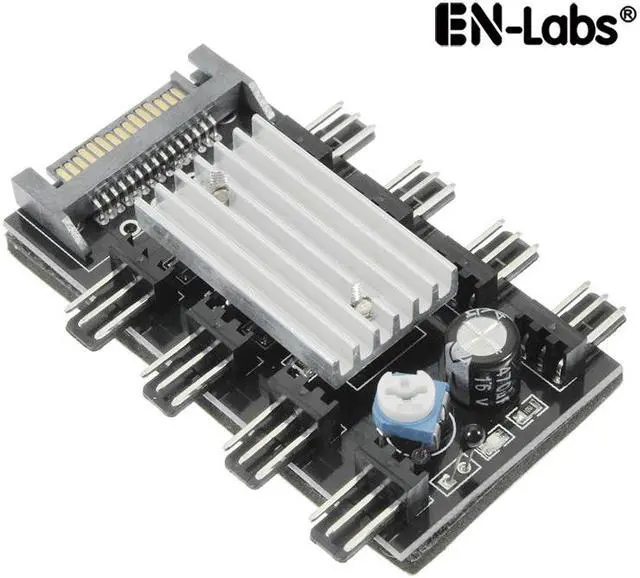 Enlabs TX3HUB8AUCOS 8 Channel 3 pin Fan Automatic Speed Controller Increase speed to reduce computer part temperature when computer parts are busy Reduce speed to reduce noise & power consumption when computer parts are free. Supports computer parts with cooling fan, like CPU, HDD, DDR, VGA, etc. Temperature sensor monitor PC case cooling system, control the speed automatically to prevent computer hardware damage from overheating effectively. It can slow down the speed when high temperature automatically Potentiometer can adjust voltage range from 5V to 11V to match fan started voltage, support all 5V~12V 3pin fans Controls and Monitors 8 Sets of 3pin fan Speed and Temperature simultaneously, total 2A current Max.