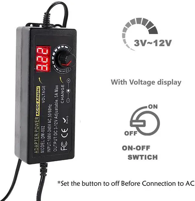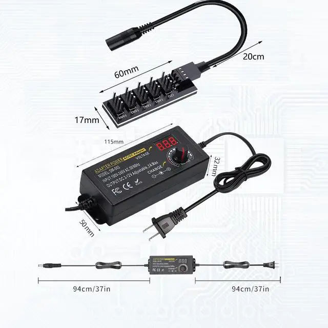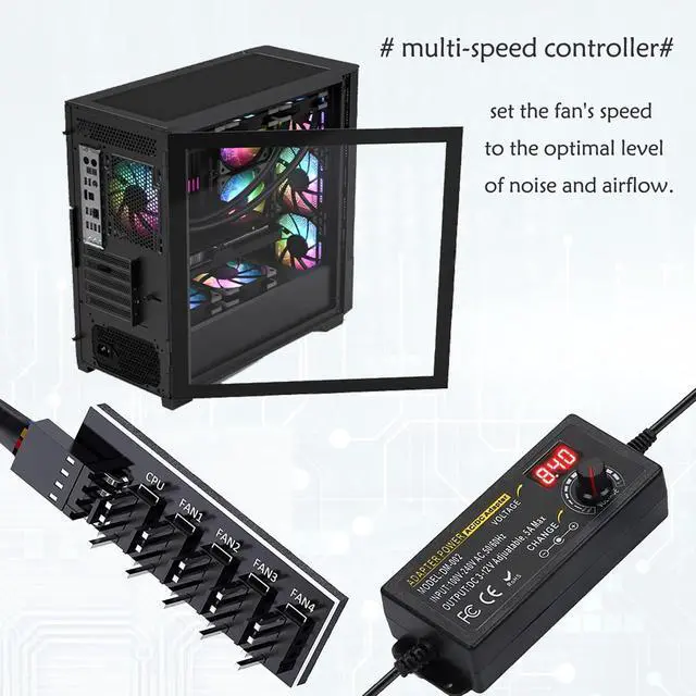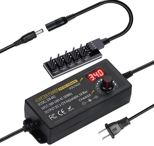Upgrade 60W PC Fan Power Supply, 3-pin 4-Pin Computer Cooler Fans Speed Controller, 12V 5A 1 to 5 Way Splitter Fan Hub Power Supply Cable,100-240vAC to 3-12vDC Adjustable Fan Power Adapter