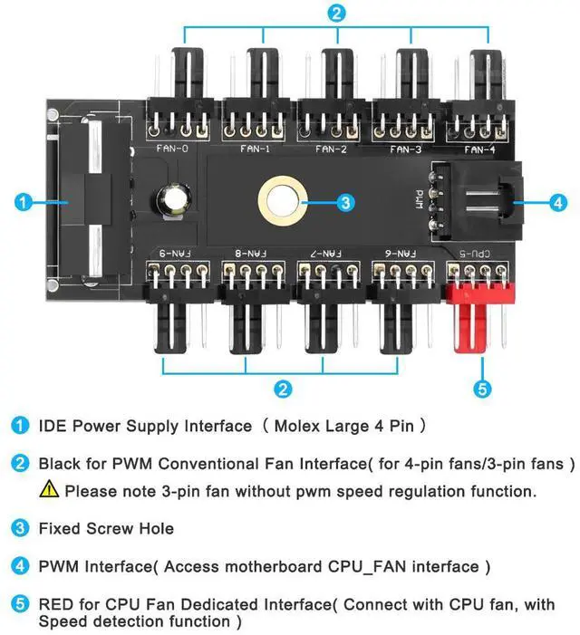2,The other 9 black fan ports CAN NOT be adjusted in speed. Because one operating system can only control speed of one fan.(The red Port)