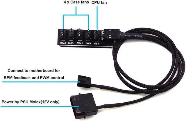Power by PSU Molex 4pin interface directly, Reduced your motherboard load when connect many fans Compatible with 12V 3-pin / 4-pin Fans (3pin fan no PWM function)