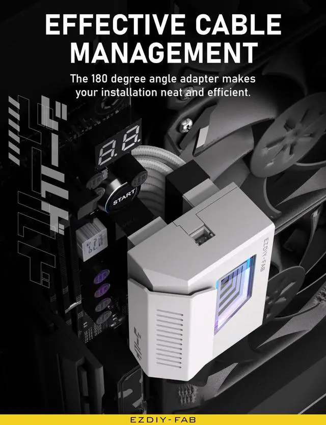 Vszerda Shield 24-Pin Angle Adapter with Infinity Mirror ARGB Light ,ATX 24 Pin Power Connector, 5V 3pin ARGB Sync-180 Degree-White