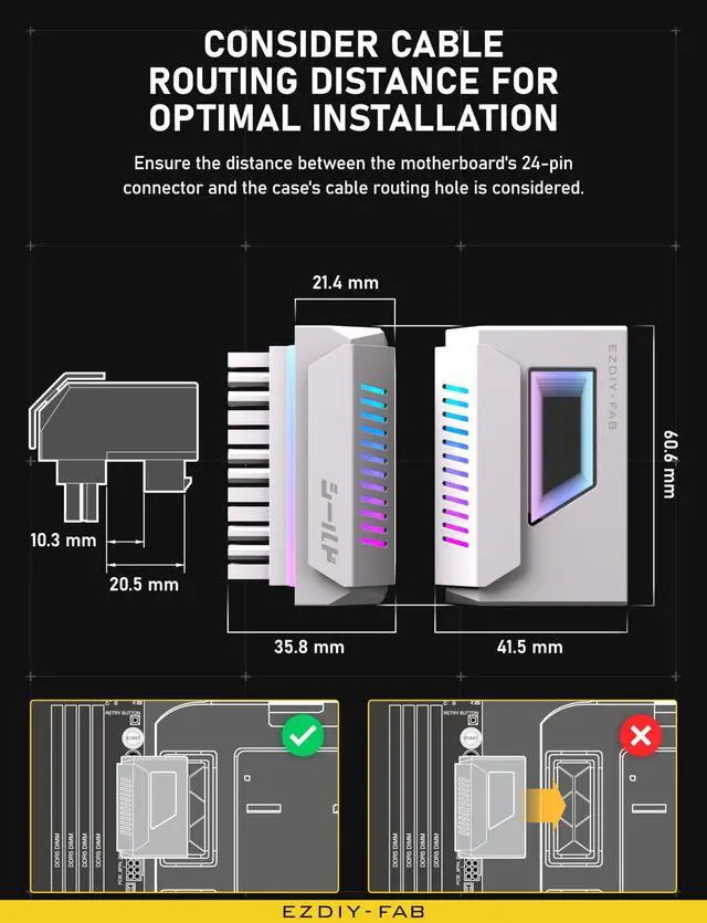 - Ensure Clearance Before Purchase: Before buying, verify that there's enough space between the motherboards 24-pin connector and the PC case routing hole to avoid installation interference. Use the provided dimensions to ensure smooth cable routing without obstruction.