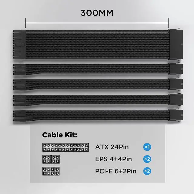 Specification: Interface Type: Male (5557) to female (5559) Cable Core: 18 AWG Cable Diameter: 3.5 mm Length: 11 4/5 inch (300cm) Default Standard: 1 x ATX 24PIN 2x EPS 4+4PIN 2x PCI-E 8Pin(6+2) Cable Combs: 4 x 24Pin 12 x 8Pin 6 x 6Pin Purchase Notes: Because of the different display setting of each computer, the pictures and real objects will be slightly color different. If you need DIY adjustment, please pay attention to use special tools and not use too much force. In case of upgrading to the appearance and structure, or different batches of material, no further notice, the real object shall prevail.