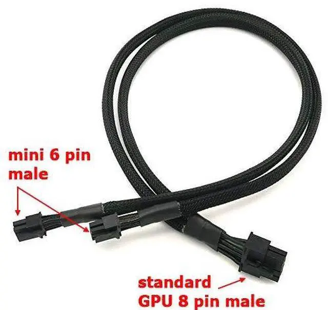 Features: Dual Mini 6 Pin to 8 Pin PCI-e cable is to connect a PCIe video graphics card with 8 pin port to Mac motherboard with mini 6 pin port; Specification: Cable Length: 15-inches Connector 1: standard GPU 8 Pin male ; Connector 2 : 2x mini 6 pin male ( not standard 6 pin male);Gauge:18AWG Including: Dual Mini 6 Pin to 8 Pin PCI-e cable*1pcs;