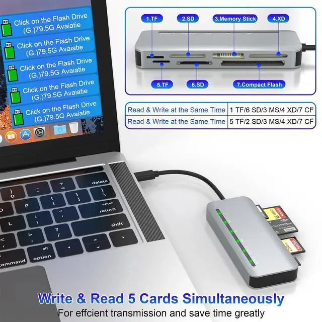Aluminum USB C Multi Card Reader with 7-Slot : SD*2 + Micro SD*2 + CF + XD + MS