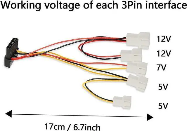 Use to connect any 3pin fan to a 4pin molex connector, The cable can add up to 5 fans(2 fans for 12V DC, 1 for 7V DC, and 2 for 5V DC )