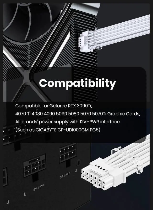 1. This cable's 16 pin (12+4) 12VHPWR connector is only suitable for RTX 5090 5080 3090Ti 4070 Ti 4080 4090 and the Modular Power Supply with 12VHPWR port. If you are not sure about this compatibility, please feel free to contact us.