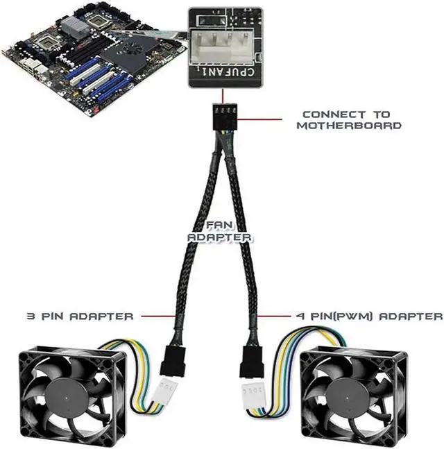PWM FAN SPLITTER Y-CABLE connects 2 computer PWM fans to a single motherboard fan header;
