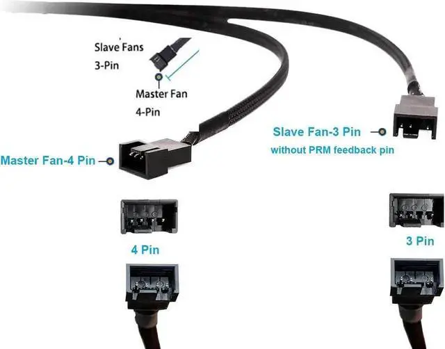 MASTER/SLAVE FAN PLUGS have a 4 pin fan connector a wire that sends the RPM signal to the motherboard connector for synchronizing the fan speed with the other fan;
