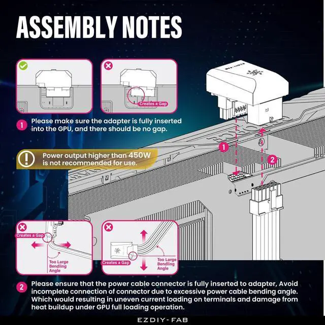 Please note that our angle adapter supports a maximum power output of 450W. Exceeding this limit may cause overheating and damage to your device. To ensure optimal performance and prevent any potential issues, please make sure that your PC case has proper ventilation.