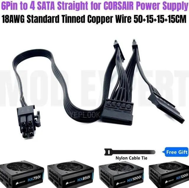 6Pin to 4x SATA 15Pin Straight for HX750i HX850i HX1000i HX1200i Modular PSUs Hard Drive HDD SSD Power Cable 18AWG 50+15+15+15CM