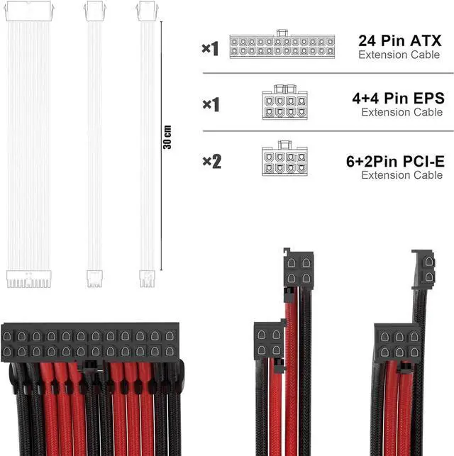 PSU Cable Extension Kit 30CM Length with Cable Combs 1x24Pin/1x8Pin(4+4) EPS/2x8Pin(6P+2P) PCI-E/PC Sleeved Cable for ATX Power Supply(Black & Red)