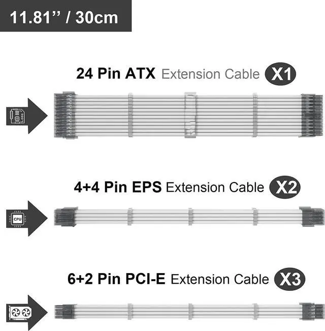 Cable Extension Includes1×24-pin ATX, 2×4+4pin EPS, 3X6+2Pin PCI-E, suitable for high power GPU and graphics card power supplies.