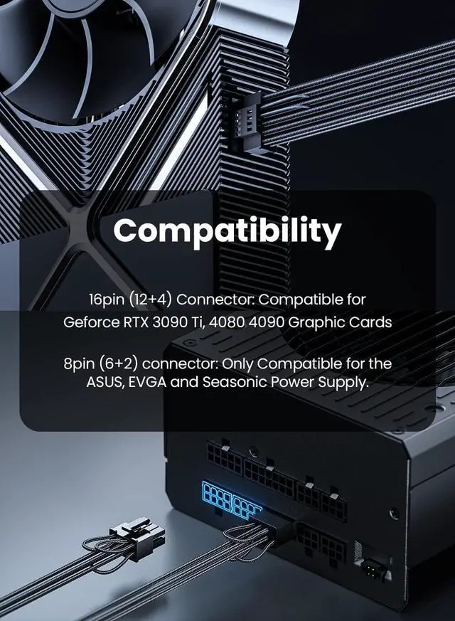 Only Compatible with ASUS/ EVGA/ Seasonic PSUFasgear PCI Express 5.0 power cable is ONLY compatible with the ASUS/ EVGA/ Seasonic Modular Power Supply that has with 8-pin (6+2) ports. One 16pin to 3 x 8pin (6+2) pcie power cable transfers power from PSU to GPU conveniently. It is a good replacement, better than the original cable and the extension cable. Please note that this cable only works for ASUS/ EVGA/ Seasonic PSU and GeForce RTX 3090ti 4080 4090 GPU.