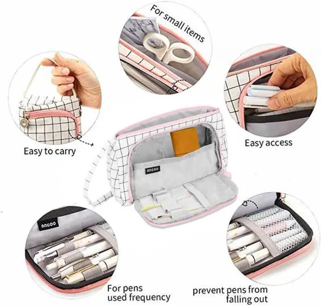• Hot Stationary Pen Storage Bag Simple Plaid Pencil Case Multi Layer Large Capacity Cosmetic Travel Canvas Pen Pencil Storage Bag