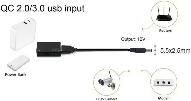 • QC3.0 DC5.5x2.5mm to USB-A Input Cable for Router Speaker LED Light QC3.0 DC5.5x2.5mm to USB-A Input Cable for Router Speaker LED Light