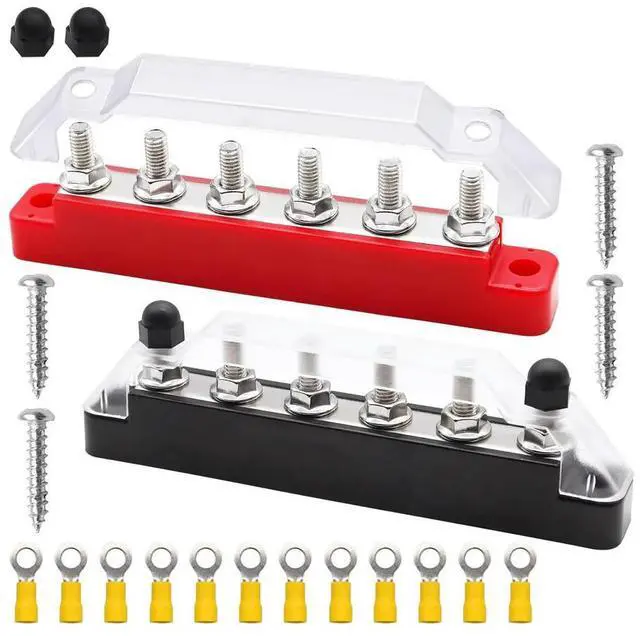 • Bus Bar 6 X 1/4Inch (M6) Terminal Studs 12V Power Distribution Block with Cover and Ring Terminals, Max 300V AC-AB01