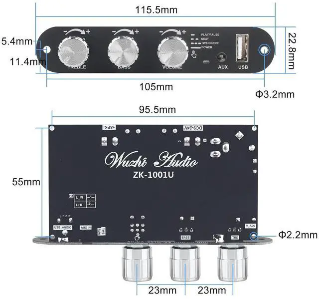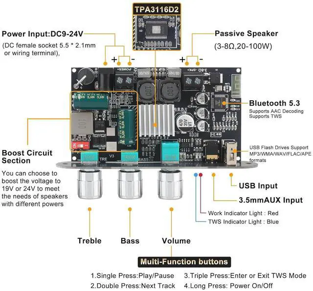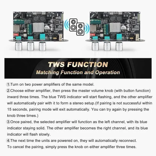 TWS True Wireless Stereo PairingSupports one-click TWS pairing to wirelessly sync two amplifier boards for immersive left/right channel stereo soundperfect for building your own wireless speaker system.