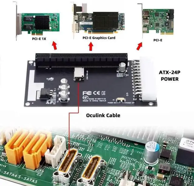 One PCIE PCI-Express 16x 4x device can be connected,The converter can be installed into the system internally through the SFF-8611/8612 oculink interface.