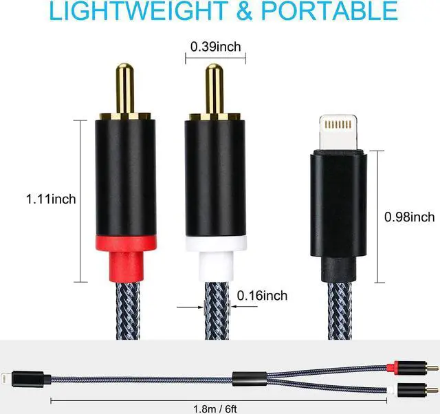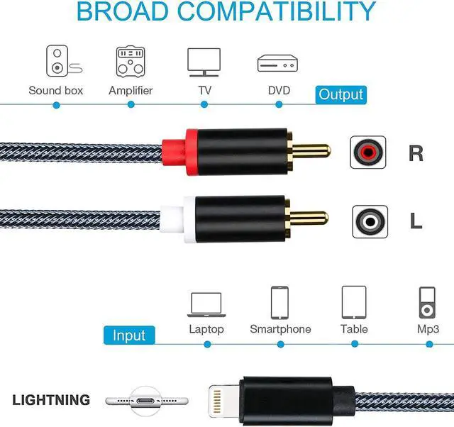 Compatible Device: This lightning to 2 RCA Audio Auxiliary Stereo Y Splitter adapters compatible with multiple devices, such as iPhone iPhone 12 Pro Max/12 Pro/12 Mini/12/11 Pro Max/11 Pro/11/XS Max/XS/XR/X/8/8 Plus/7/7 Plus/6S/6S Plus/5/5S/SE and iPad Pro/Air/Mini/iPod touch, and more to the speaker, stereo receiver, car Aux Speaker Power amplifieror other RCA device.