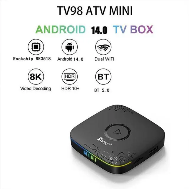 • TV98 TV Box Android 14 ATV Ultra HD 8K Video 2.4/5G 6 Media Player Portable Player Support Voice Remote 2+32G