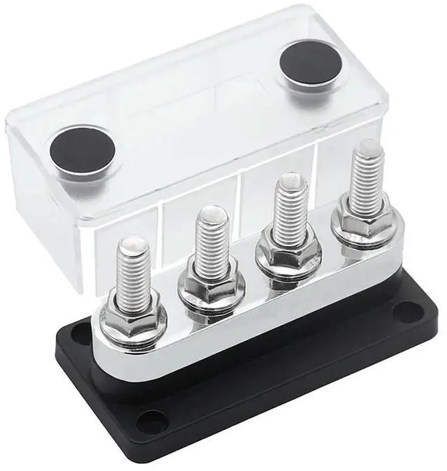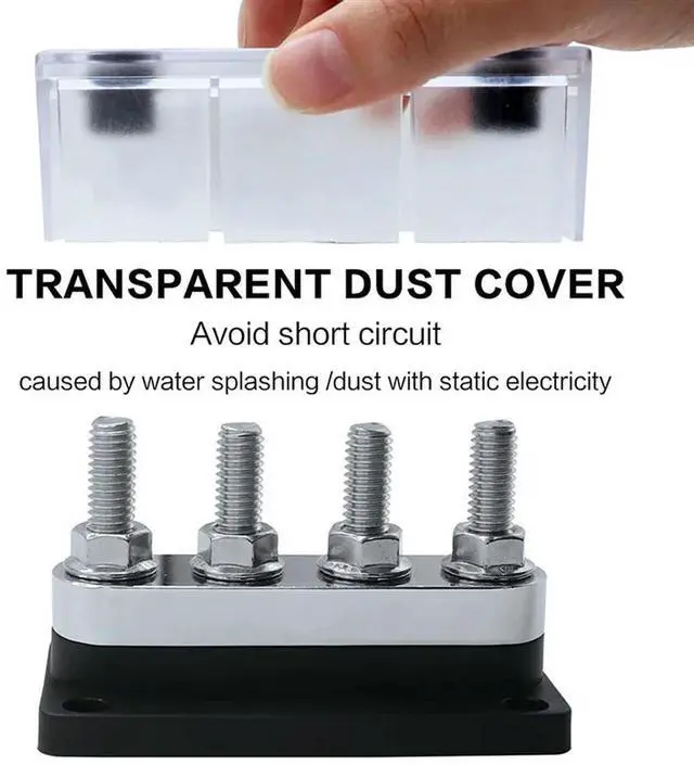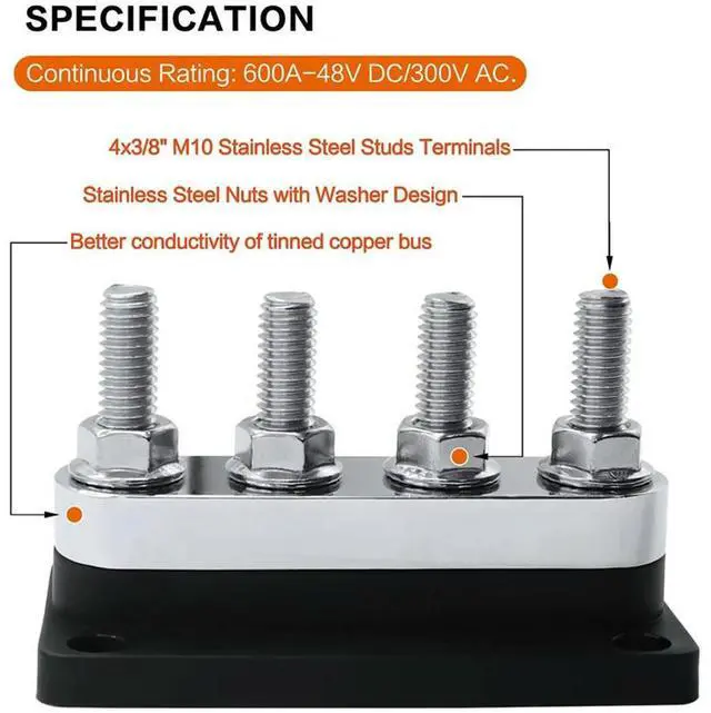 • 600A Bus Bar 4-Stud (3/8 Inch) M10 High Current Copper Busbar Terminal Block Marine DC 12V 24V 48V with Cover(Black)