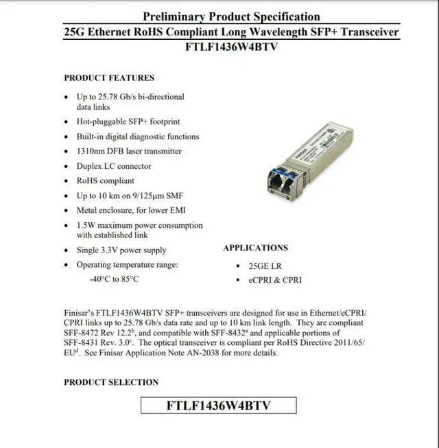 • 1PCS finisar fiber module SFP 25gb LR 10KM/FTLF1436W4BTV/-40°C to 85°C 25g Single mode optical
