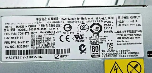 • X3550 M4 X3650 M4 550W Hot Swap Power Supply 94Y8112 7001676-J002 94Y8111