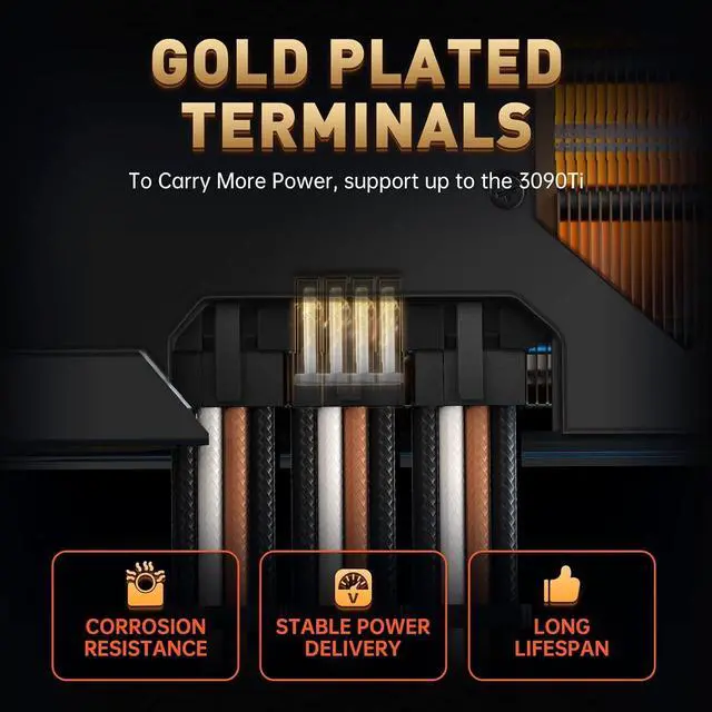 High-Quality Gold-Plated Terminals Say goodbye to wear and tear! Our GPU cables feature unique gold-plated connectors that last 12 times longer than ordinary RGB cables. Tested to withstand over 15,000 bends, these connectors are built for durability. Developed based on extensive market and user feedback, our cables fit all major graphics cards and meet every need. Get the reliability you deserve!