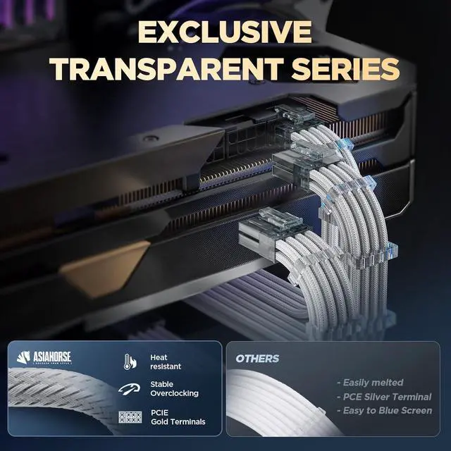 AsiaHorse PSU Cable Extension Kit of Clear Connector, 24Pin/4+4 EPS/6+2 PCI-E 16AWG ATX Power Supply Sleeved Cable Kit for Two-Way CPU Performance, 30CM Length with White Combs