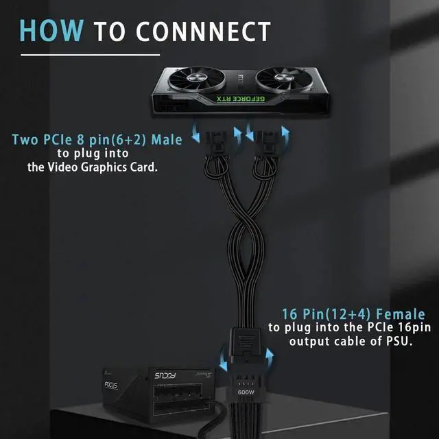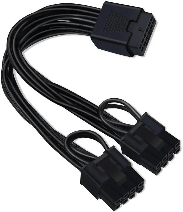 Features: The 16 Pin to Dual 8 Pin(6+2) PCIe Conversion GPU Power Cable is used to convert 16pin(12+4) port to dual 8pin(6+2) male port. Support: All of PSUs with 16pin(12+4) port.(Note: This is conversion cable, Not modular cable) Specification: Length(including connectors):7.67-inch(19.5cm); Connectors: 16(12+4) pin female, Dual pcie 8(6+2) pin male; Gauge: 16AWG(standard tin-coating copper wire); Rated power: 600W; Including: 16 Pin to Dual 8 Pin(6+2) PCIe Conversion GPU Power Cable *1pcs. Self-adhesive tape *1pcs.