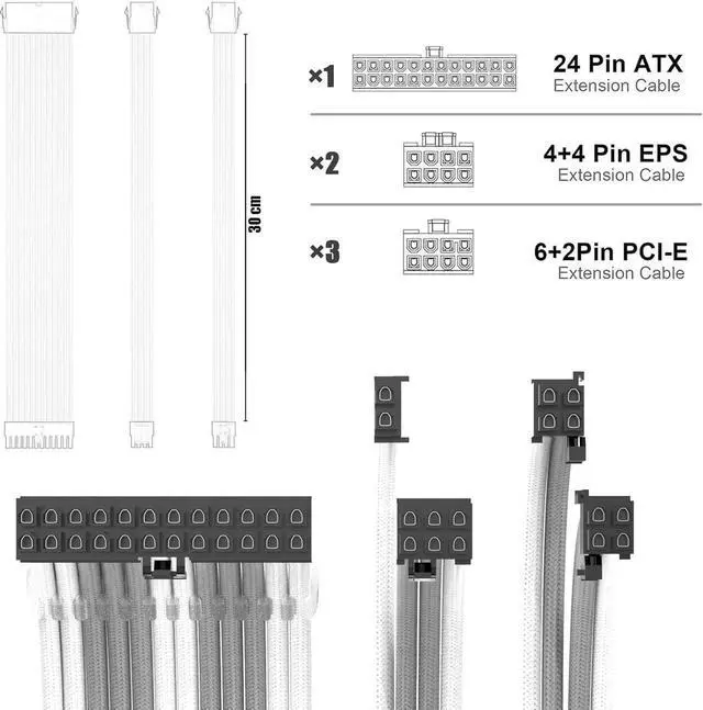PSU Cable Extension Kit 30CM Length with Combs,1x24Pin/2x8Pin(4+4) EPS/3x8Pin(6P+2P) PCI-E/PC Sleeved for ATX Power Supply,9 White & Grey)