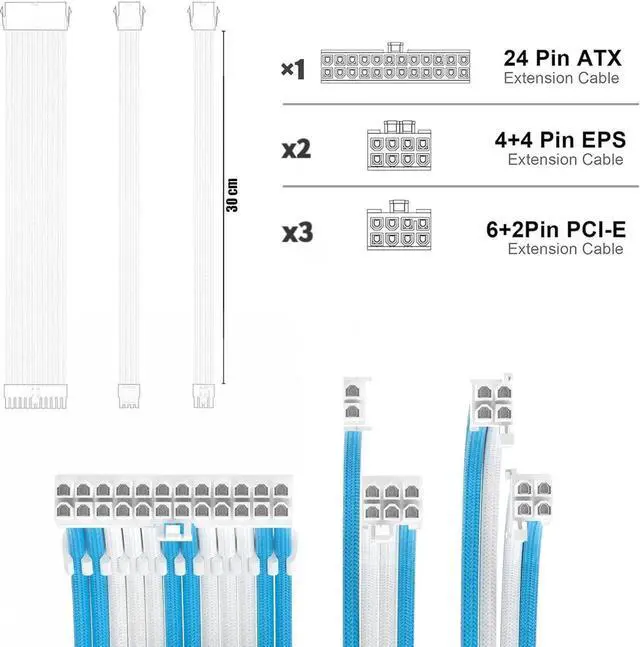New Generation PSU Cable Extension -The length of each power cable is 30cm. PSU cable kit uses Triple Layer Weaving design and is wrapped with super soft silicone, which can be easily formed into the desired shape. Through market research, we found that other brands of PSU extension cable kits are difficult to bend. Due to processing problems, products of other brands are prone to produce odor when used at high temperature. cable kits have effectively improved this situation.