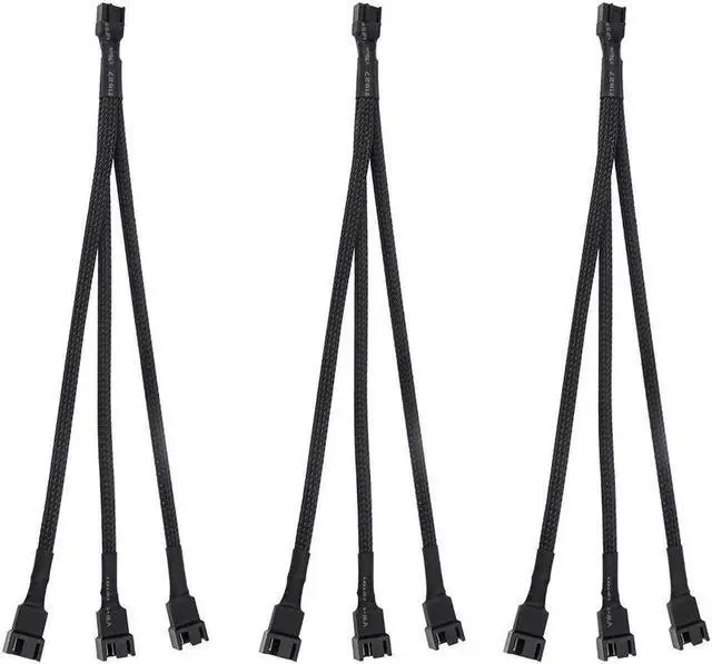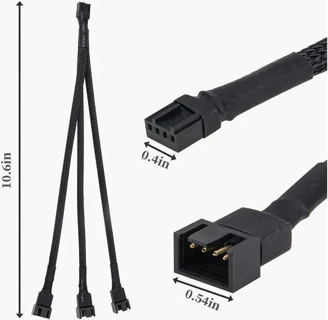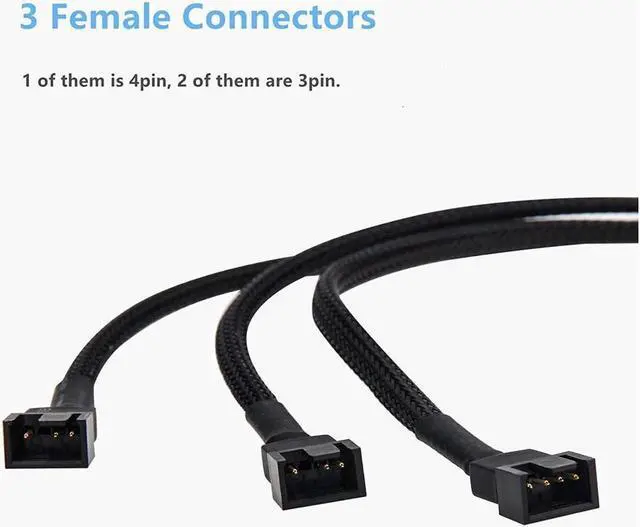 The PWM fan splitter connects 3 computer fans to one motherboard fan header used to install more fans to keep the PC cool. Compatible with all 4 pin and 3 pin case fans. Easy to use and install the fan splitter extension cable offers greater flexibility and durability. All black sleeved nylon braided cable more durable and make the inside of pc case looks more clean and tidy. Sleeved in black braiding with a 4 pin female connector at one end and splits to 3 male connectors (1 of them is 4pin 2 of them is 3pin )