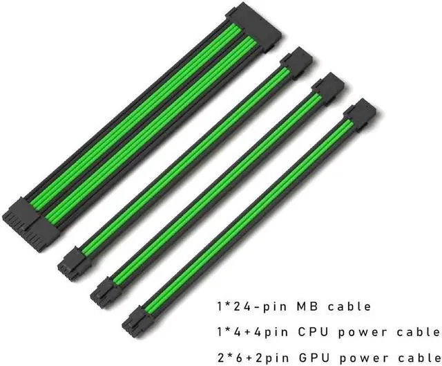 Mod Sleeved Cable, Black & Green Power Supply Cable Extension Kit, 24PIN ATX, 4+4 PIN EPS, Dual 6+2 PIN PCIE(11.81")