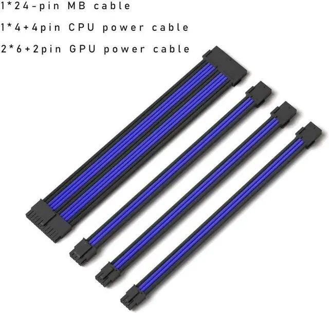 Mod Sleeved Cable, Black & Blue Power Supply Cable Extension Kit, 24PIN ATX, 4+4 PIN EPS, Dual 6+2 PIN PCIE(11.81")