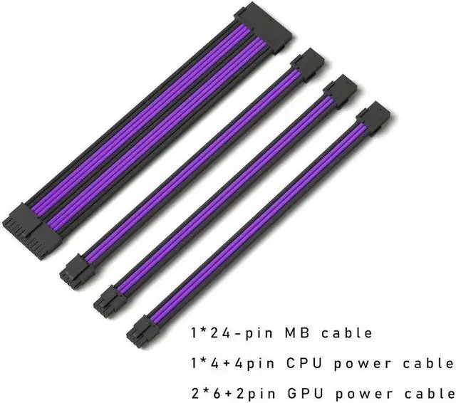 Mod Sleeved Cable, Black & Purple Power Supply Cable Extension Kit, 24PIN ATX, 4+4 PIN EPS, Dual 6+2 PIN PCIE(11.81")