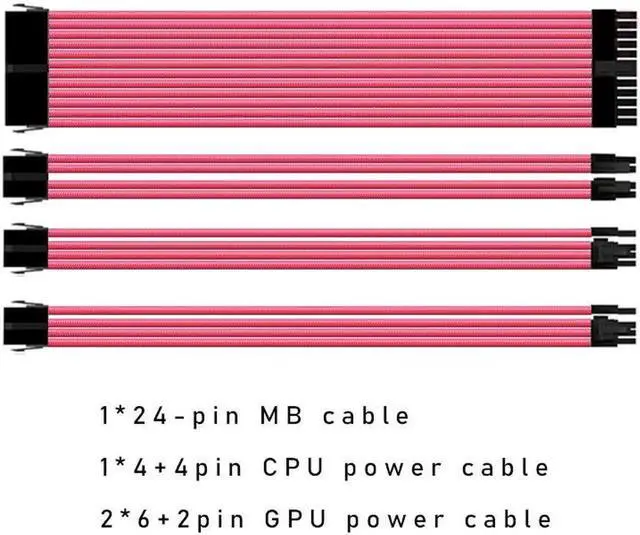 Mod Sleeved Cable, Pink Power Supply Cable Extension Kit, 24PIN ATX, 4+4 PIN EPS, Dual 6+2 PIN PCIE(11.81")