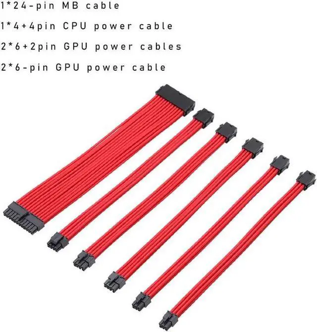 Mod Sleeved Cable, Red Power Supply Cable Extension Kit, 24PIN ATX, 4+4 PIN EPS, Dual 6+2 PIN PCIE, Dual 6 PIN PCIE(11.81")
